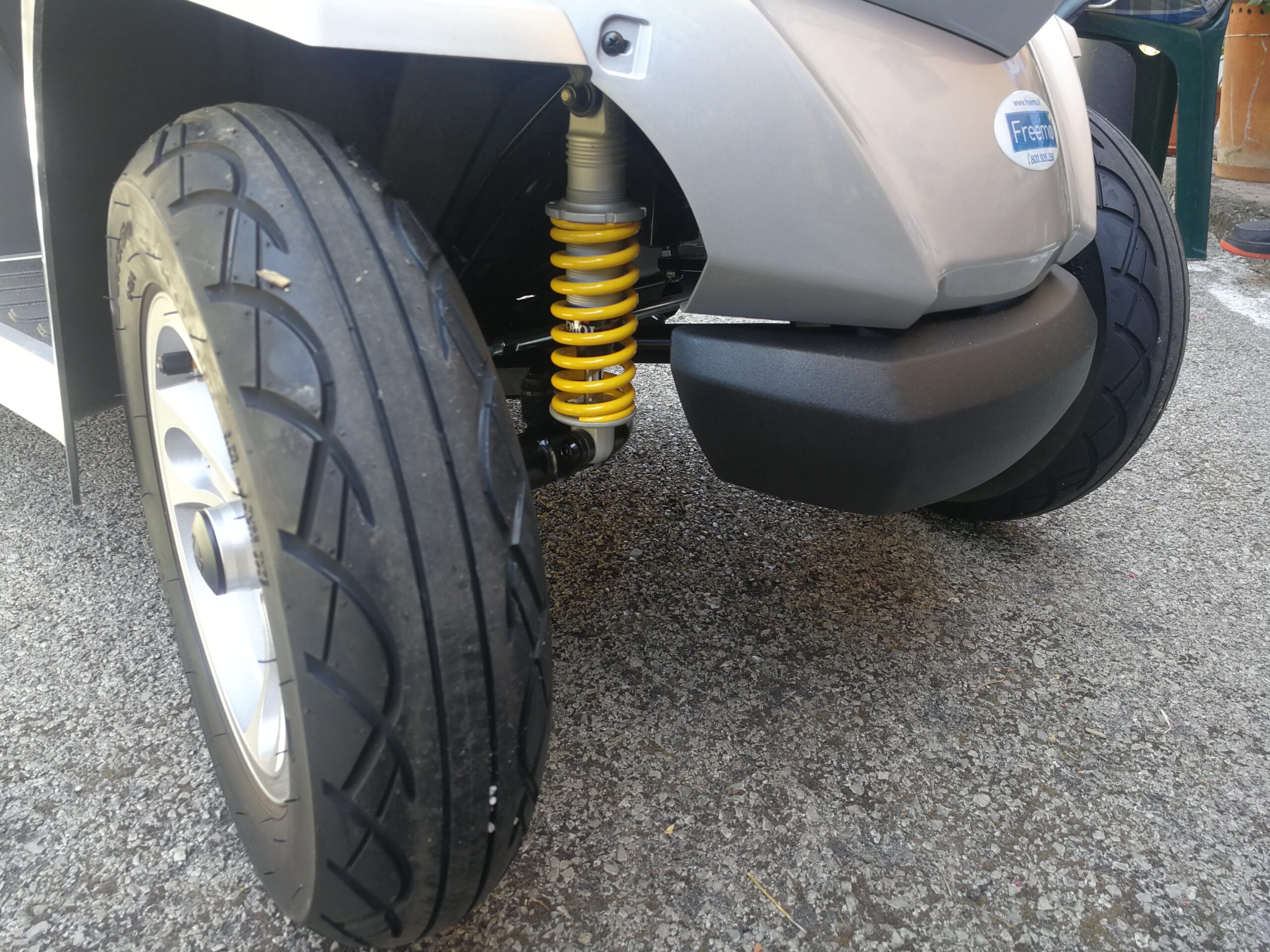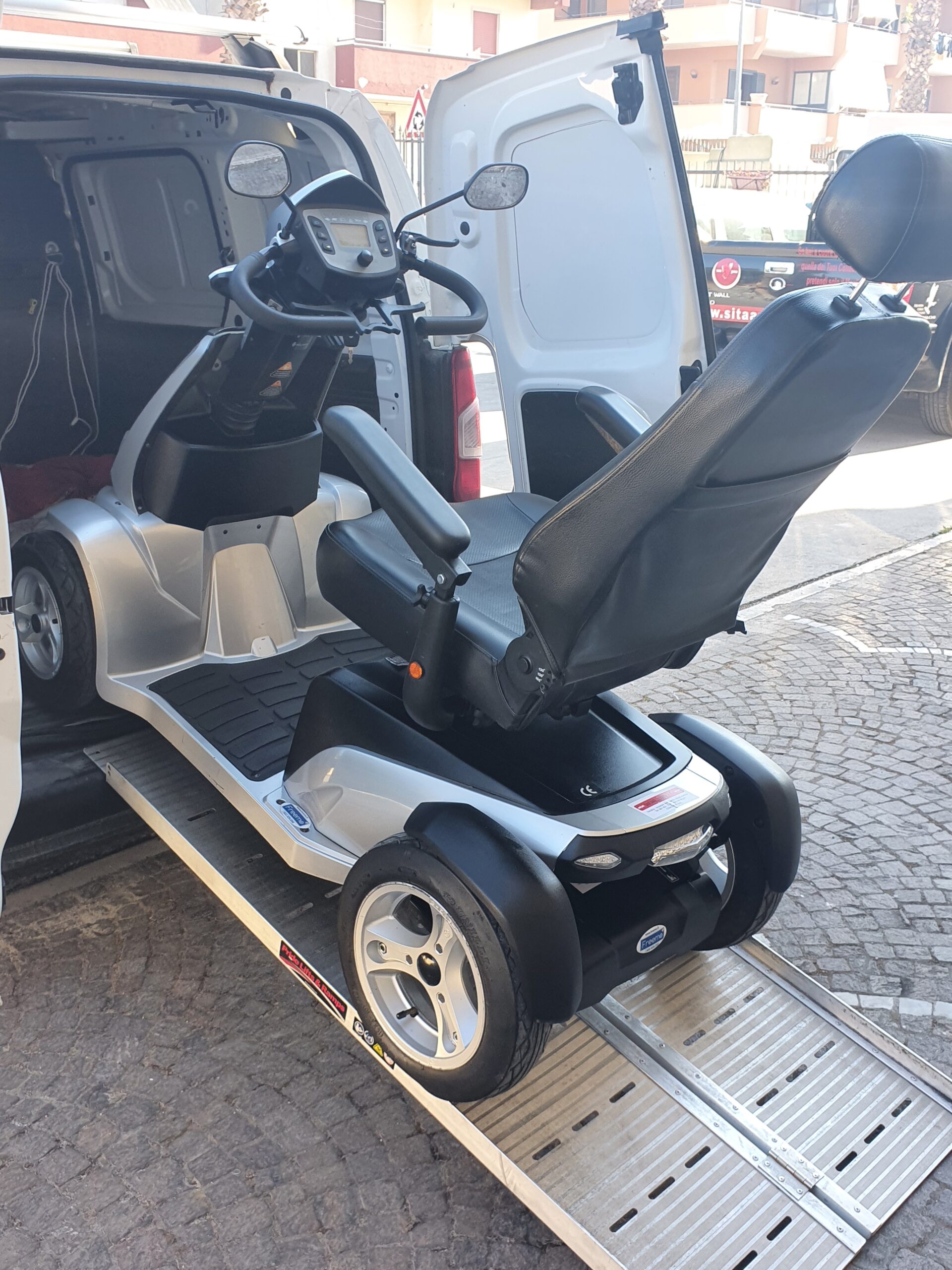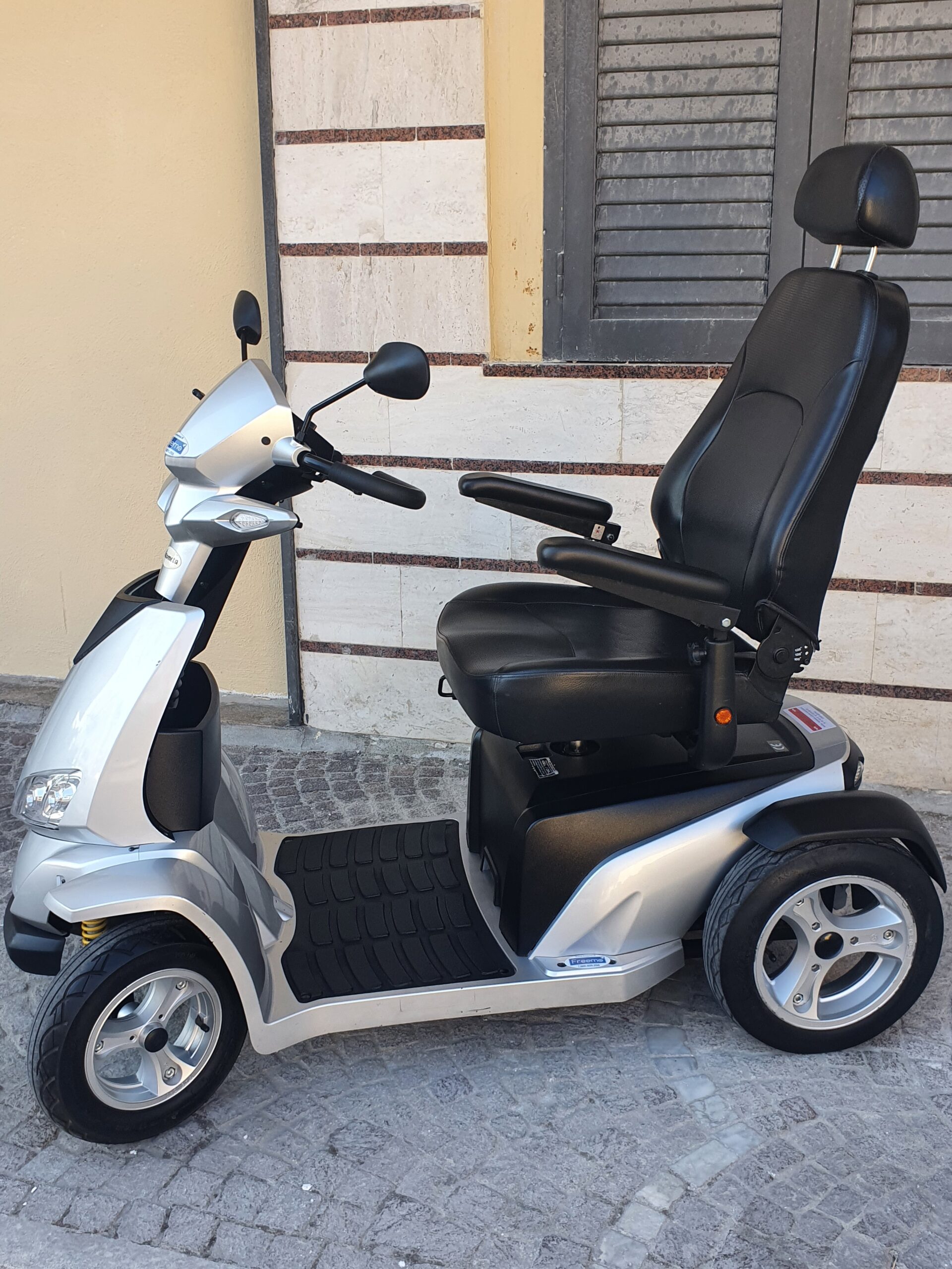 Dotato di braccioli regolabili, schienale ribaltabile, e paraurti robusti. Sistema frenante elettrico e idraulico, freno elettromagnetico per fermate sicure. Guida facile anche con una sola mano grazie al controllo a levetta.