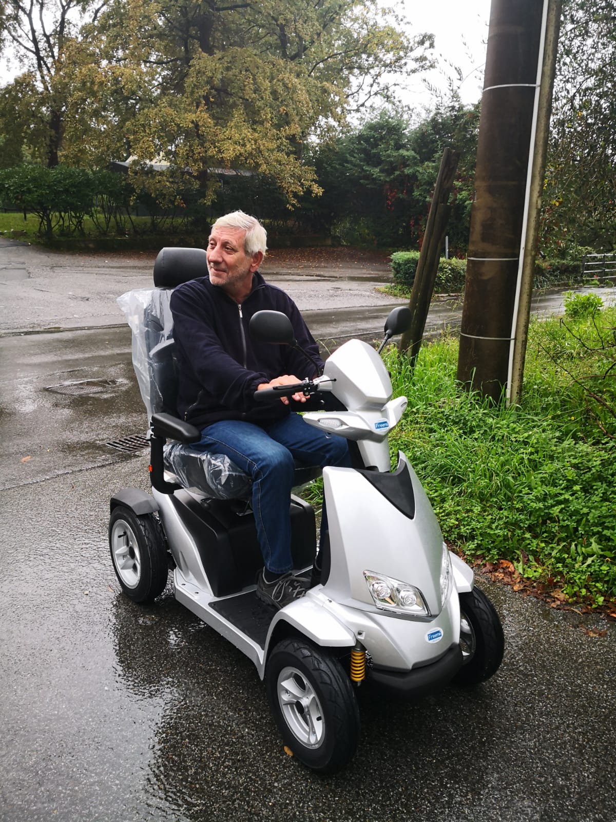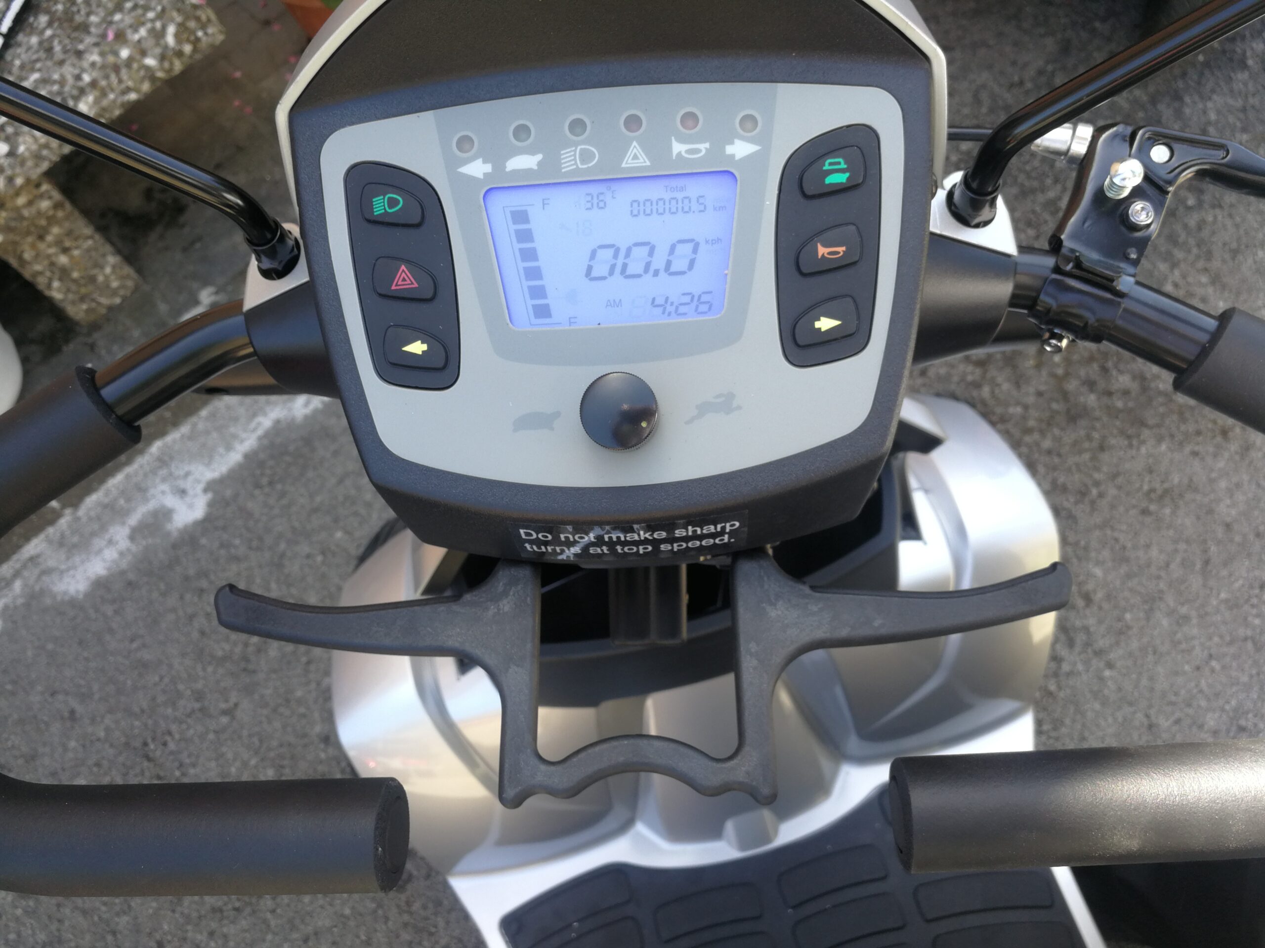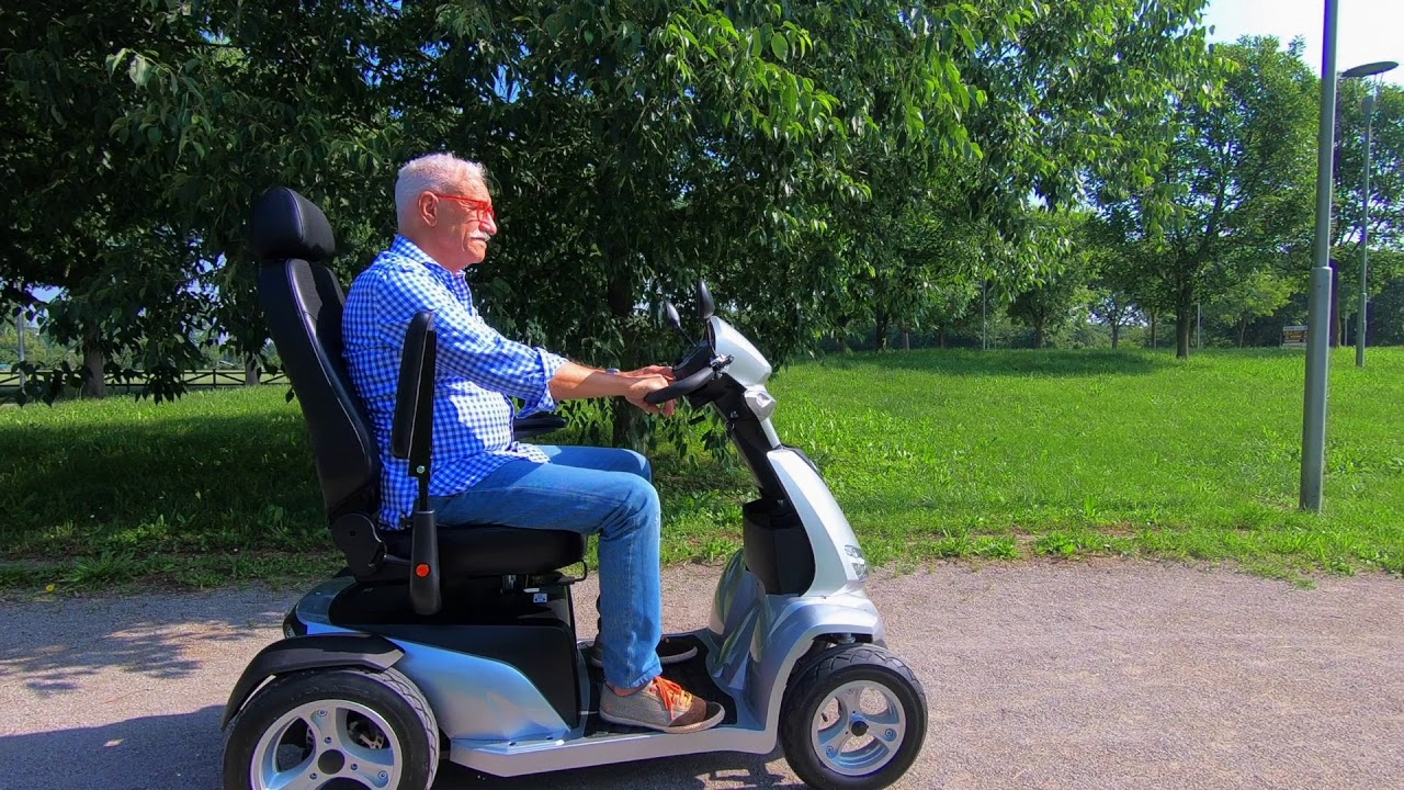 Dotato di braccioli regolabili, schienale ribaltabile, e paraurti robusti. Sistema frenante elettrico e idraulico, freno elettromagnetico per fermate sicure. Guida facile anche con una sola mano grazie al controllo a levetta.
